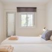 El dormitorio principal cuenta con dos camas individuales unidas y ventilador de techo.